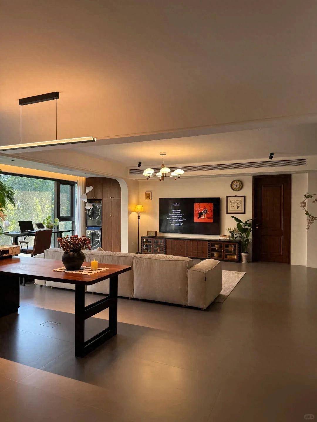 如果说空间、采光是横厅的 “硬优势”,那提升家庭凝聚力就是它的 “隐藏价值”。传统竖厅大多是 “电视中心制”,家人坐在沙发上都对着屏幕,彼此背对背,交流很少。而横厅打破了这种隔阂,实现了 “平行共处”:我在沙发上处理工作,孩子在旁边的地毯上搭积木,妻子在餐岛插花,我们各做各的事,却抬眼就能看到彼此,想说句话、递个东西都很方便。